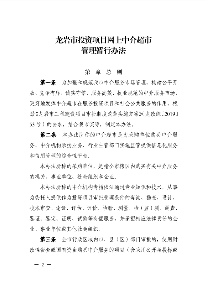 龍巖市人民政府辦公室關(guān)于印發(fā)龍巖市投資項(xiàng)目網(wǎng)上中介超市管理暫行辦法的通知(龍政辦[2019]111號(hào))