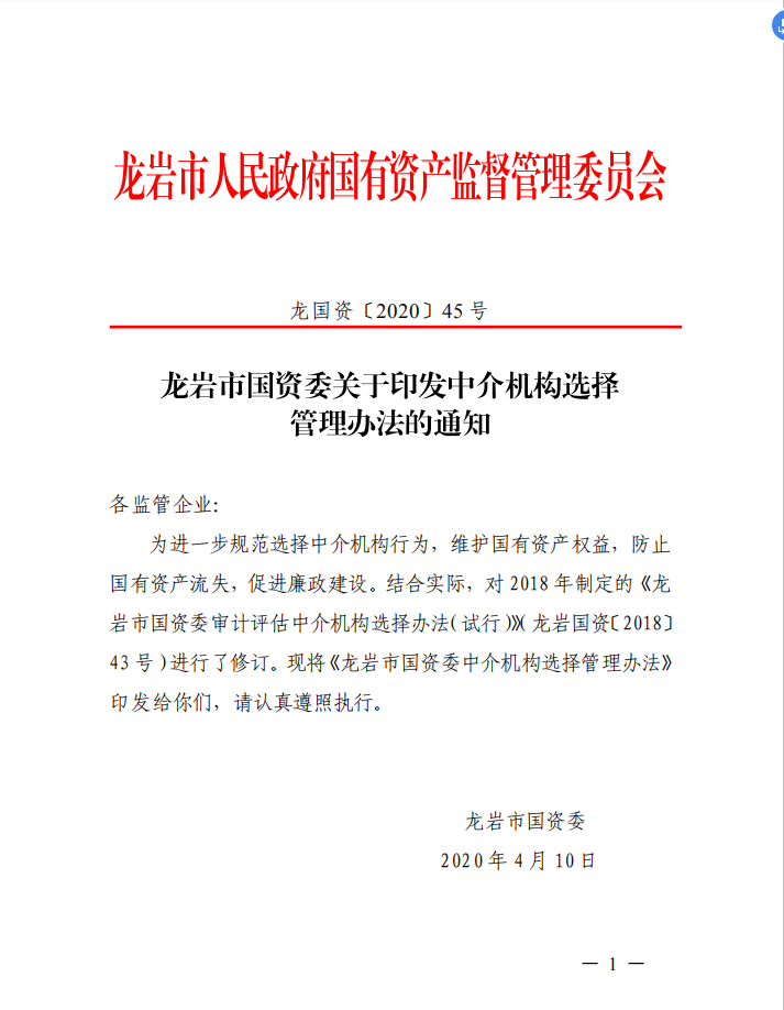 龍巖市國資委關(guān)于印發(fā)中介機構(gòu)選擇管理辦法的通知(龍國資[2020]45號)